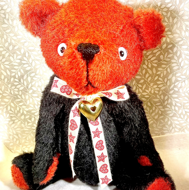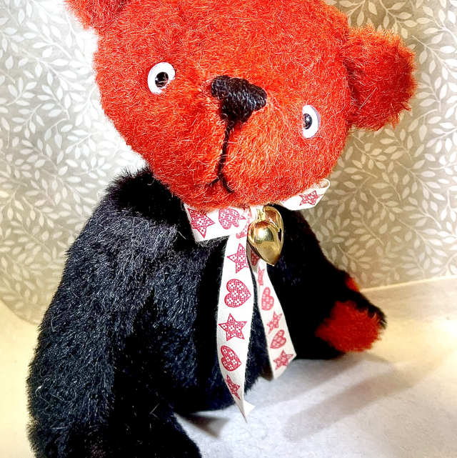 Petit ours en mohair noire pour le corps et rouge pour la tête et les coussinets.