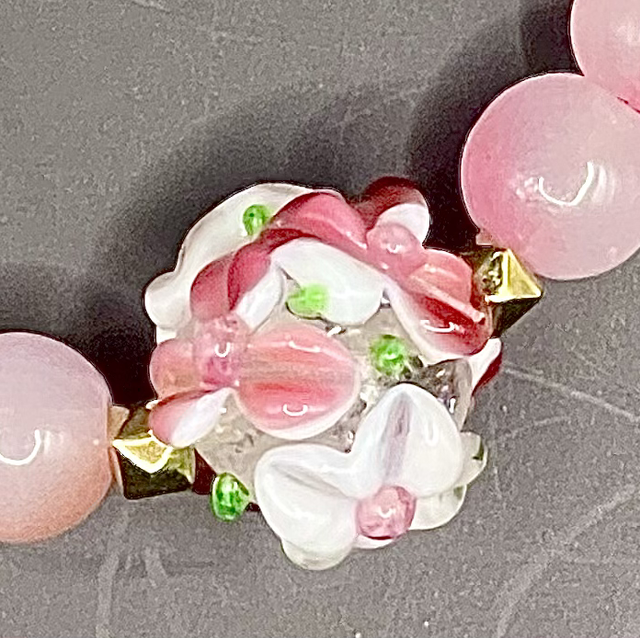 B001 - Bracelet perles verre roses perle centrale verre sculptée