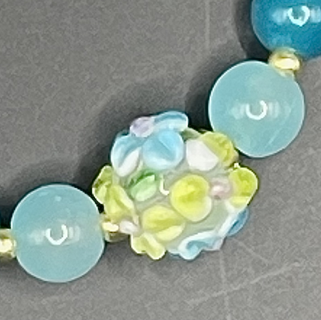 Bracelet perles en verre tons vert bleuté. Inter-perles dorées. Perle centrale en verre sculptée.