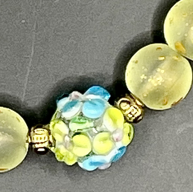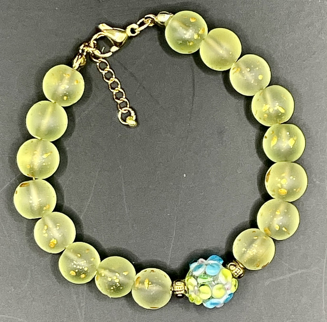 Bracelet perles en verre jaune tachés de doré. Inter-perles dorées. Perle centrale en verre sculptée.