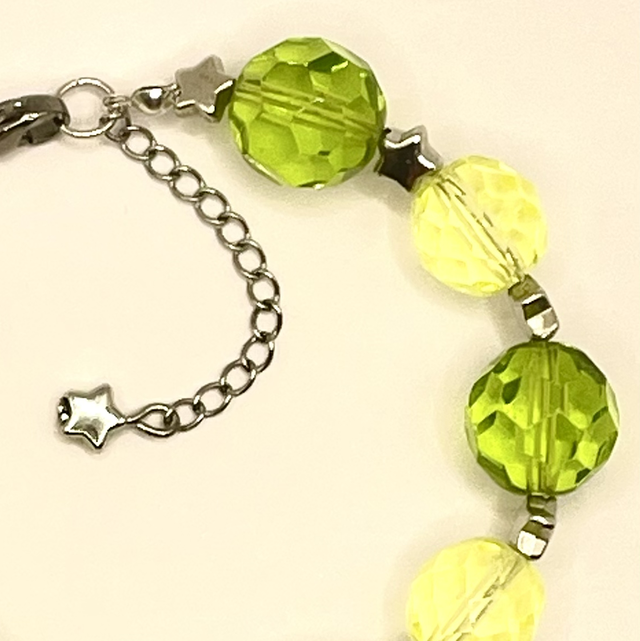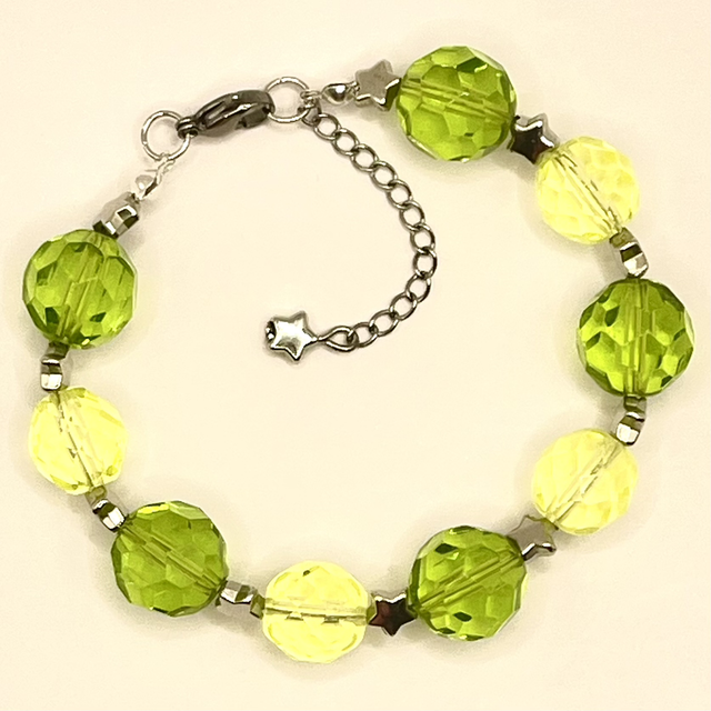 Bracelet perles en verre à facettes tons verts. Inter-perles forme étoiles dorées.