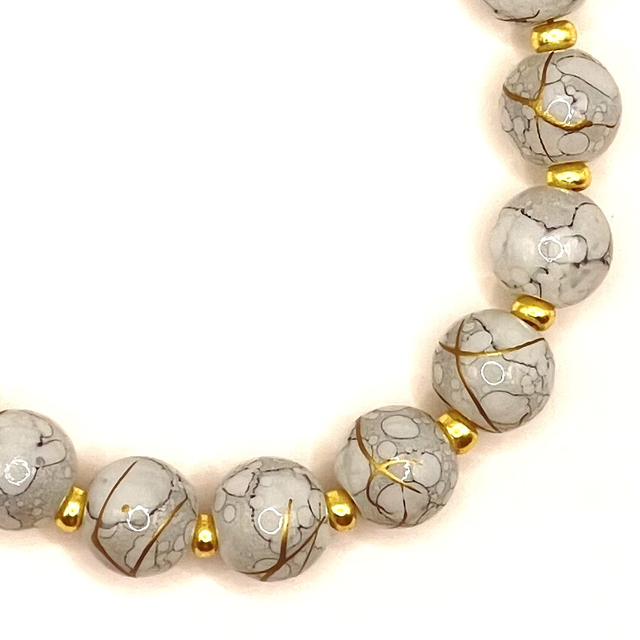 Bracelet perles en verre grises bleutés clair parsemées de filets dorés.