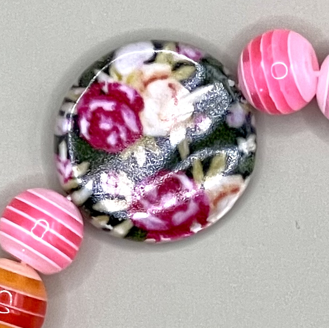 Bracelet perles en résine ton rose. Perle plate fleurie en résine.