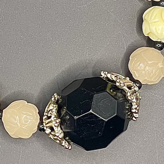 Bracelet perles en résine saumon et écrue. Perle centrale en resine noire entourée d’inter-perles arpentées.