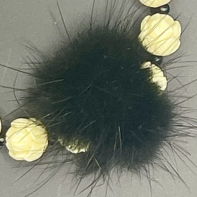 Bracelet perles en résine écrue. Perle centrale pompon noir.