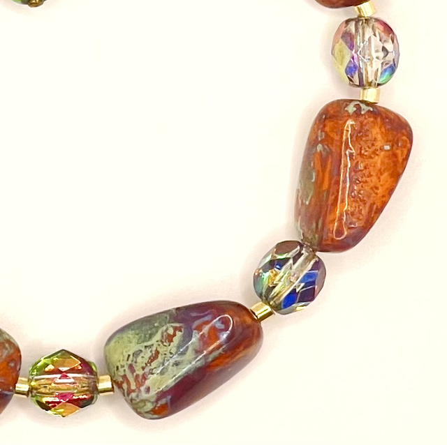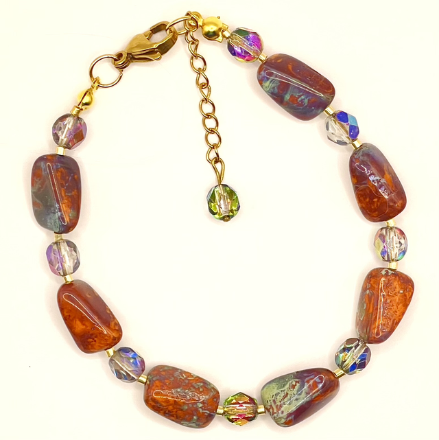 Bracelet composé de 7 perles jaspe sanguin. Inter-perles en verre à facette colorées.