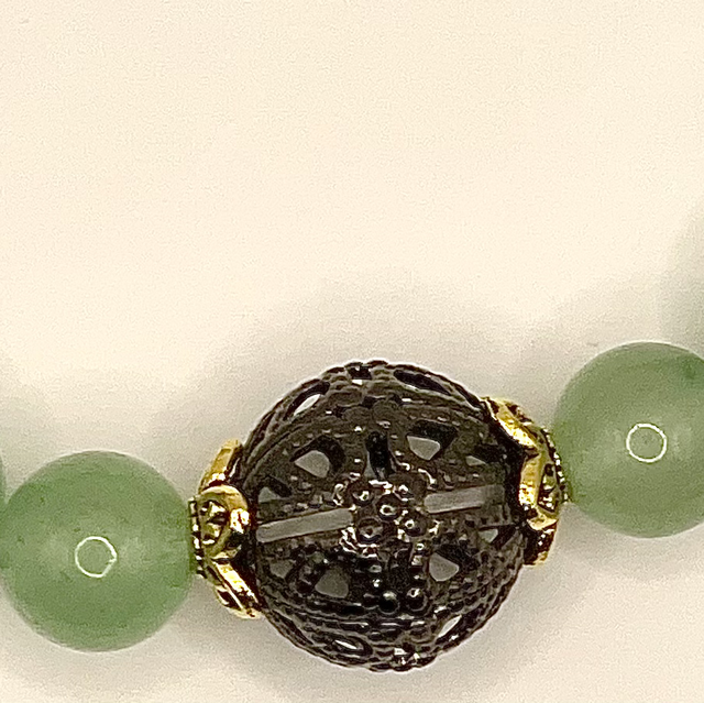 Bracelet perles aventurine et perle en métal noir et inter-perles dorées.