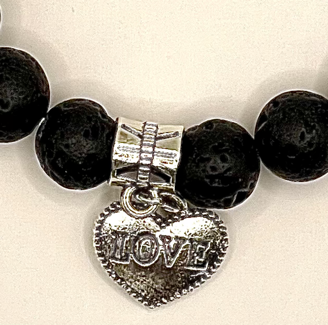 Bracelet perles pierre de lave et breloque cœur.