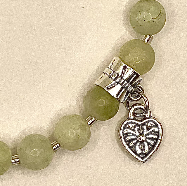 Bracelet perles pierre aventurine, inter-perles en verre et breloque cœur.