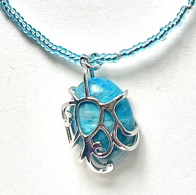 Collier perles en verre ton bleu et argent, et pendentif pierre apatite bleue dans griffe métal argenté.