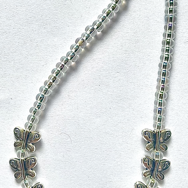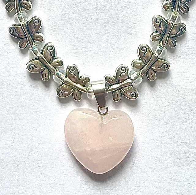 Collier perles en verre transparentes, breloques papillons en acier inoxydable argent et pendentif cœur quartz rose.