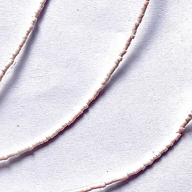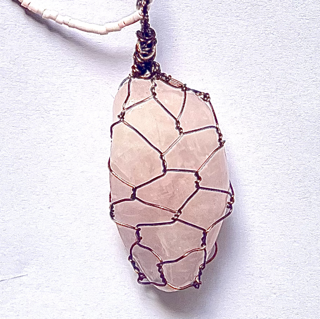 Médaillon pierre quartz rose dans filet métal cuivré.