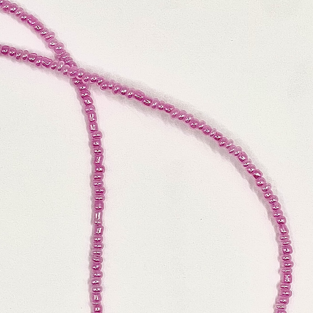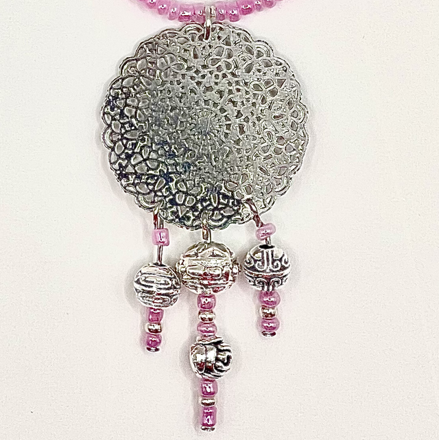 Collier perles de rocaille roses. Pendentif en acier inoxydable rosace avec breloques.
