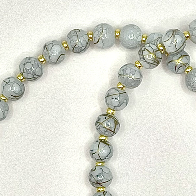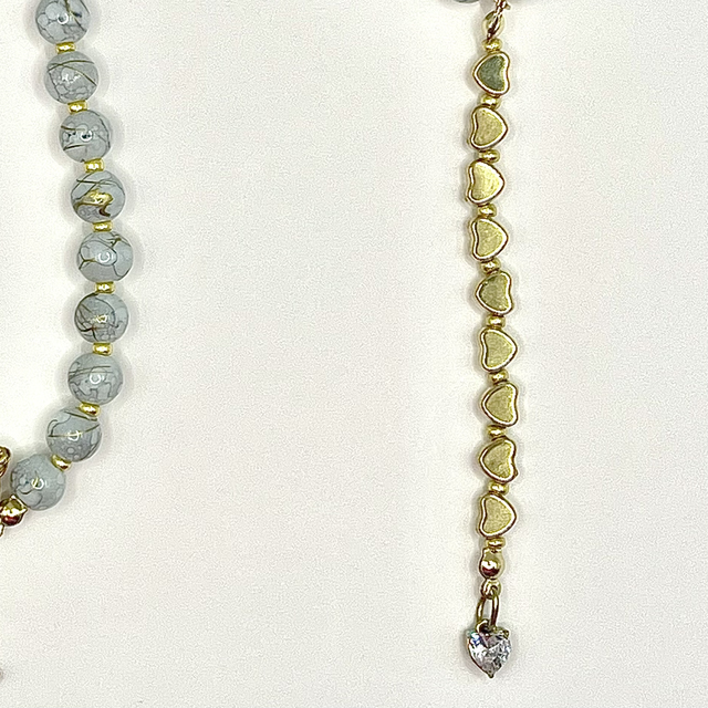 Collier perles en verre bleues très clair parsemées de filets dorés. Pendentif forme de cœurs dorés et fini par strass.