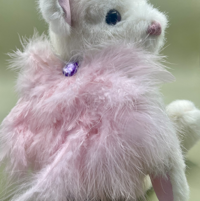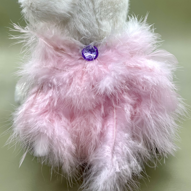 Au dos des ailes en plumes roses retenues par un ruban rose pale noué autour du cou.