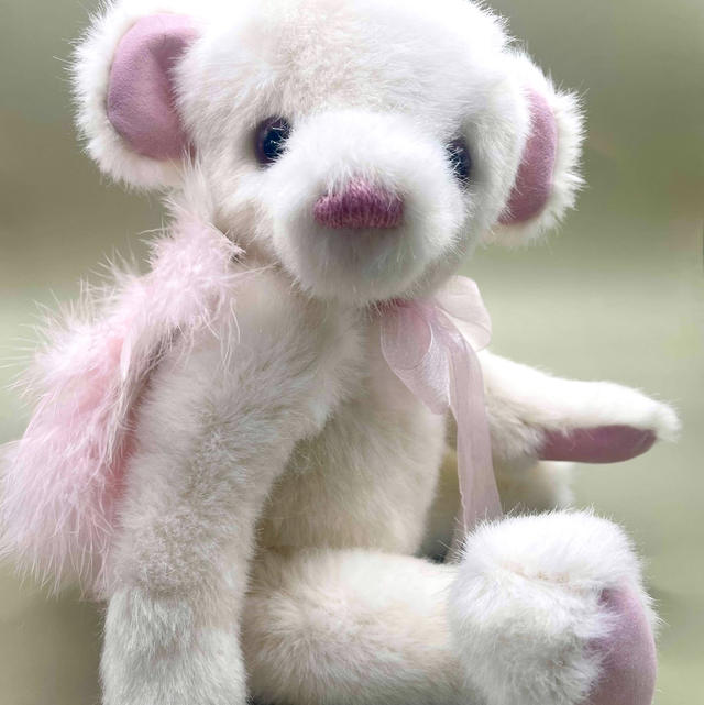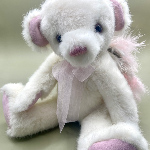 Eden est un ours en mohair de très haute qualité blanche. Les coussinets et l’intérieur des oreilles sont suédine rose.