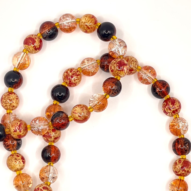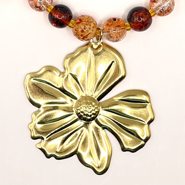 Collier perles en verre tons d’orange, et inter-perles de rocailles oranges. Pendentif fleur en acier inoxydable doré.