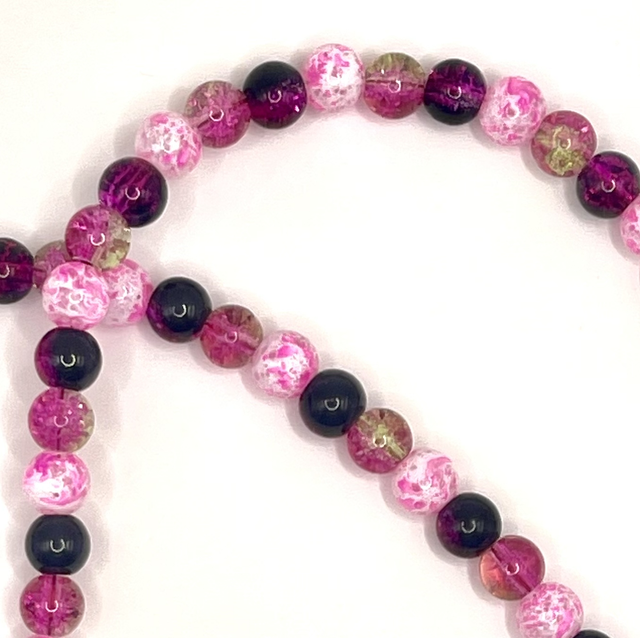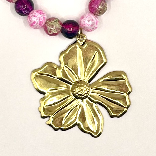 Collier perles en verre tons de rose. Pendentif fleur en acier inoxydable doré.