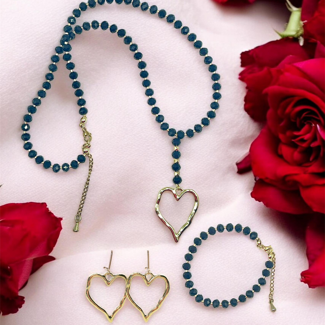 Collier perles en verre noires à facette. Pendentif en forme de cœur en acier inoxydable doré.