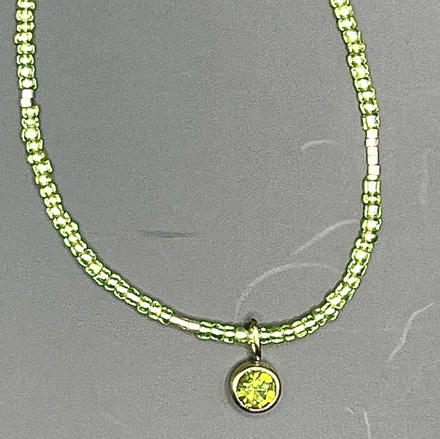 Collier perles série « saison ». Été fait de perles de rocaille vertes et dorées. Pendentif strass vert.