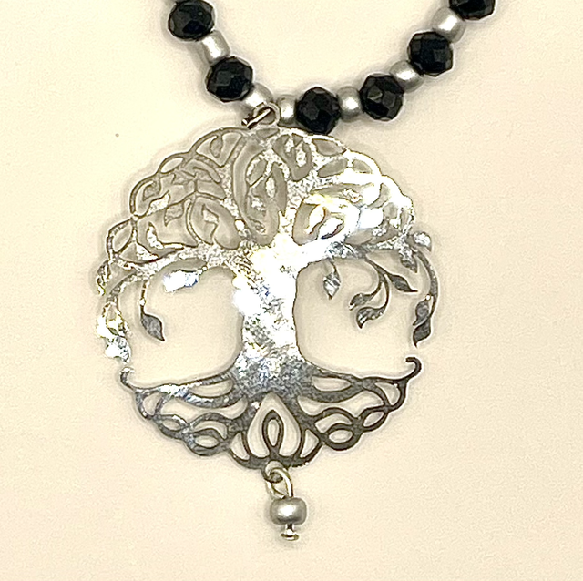 Collier perles en verre noires et inter-perles en verre argent. Pendentif arbre de vie en acier inoxydable argenté.