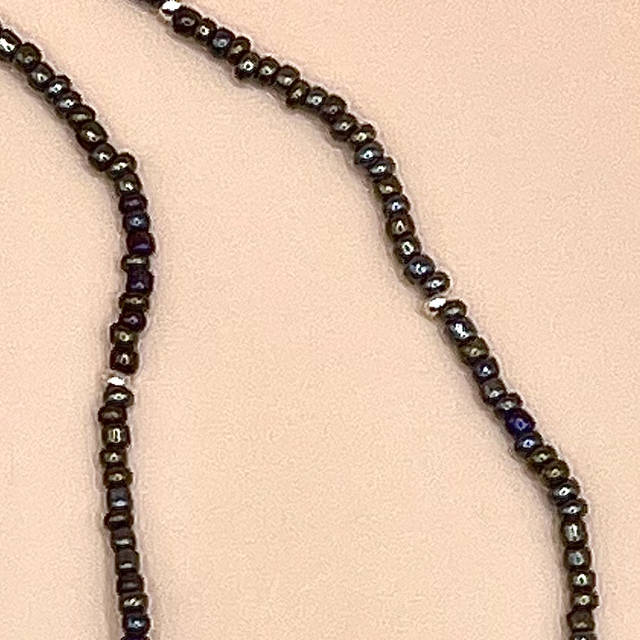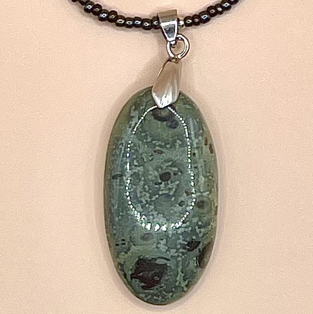 Collier perles de rocaille noires moirées et argentés espacées symétriquement. Pendentif en jaspe kambaba.