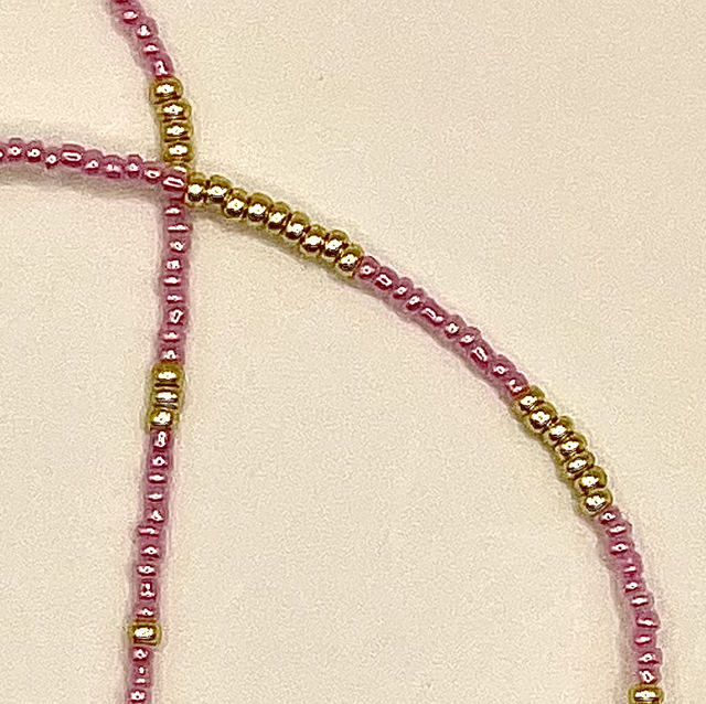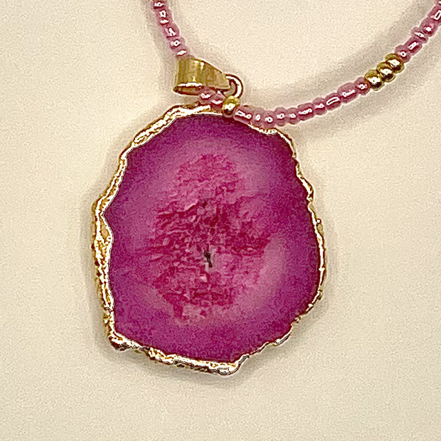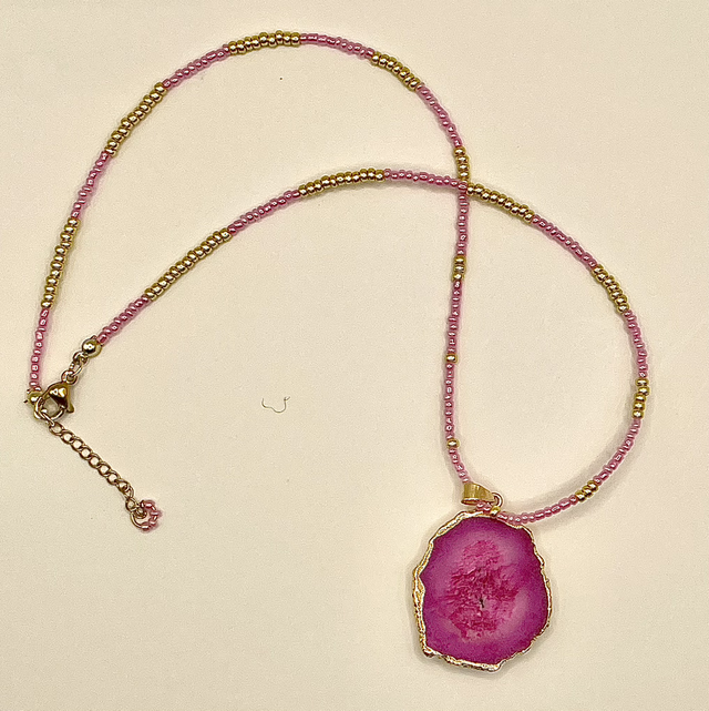 Collier perles de rocailles rose et dorées. Pendentif agate rose teintée.