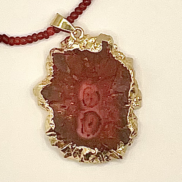 Collier perles de rocailles tons rouges. Pendentif agate rouge teintée.