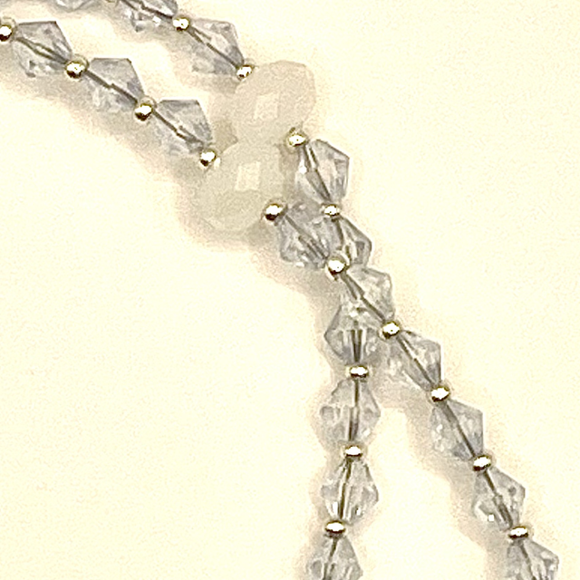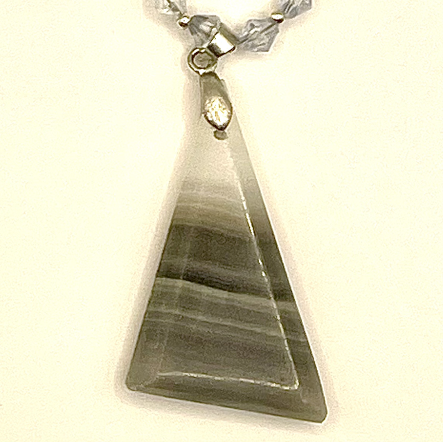 Collier perles en verre à facettes transparentes forme toupie, et perles ovales à facettes blanches. Pendentif agate rubanée.