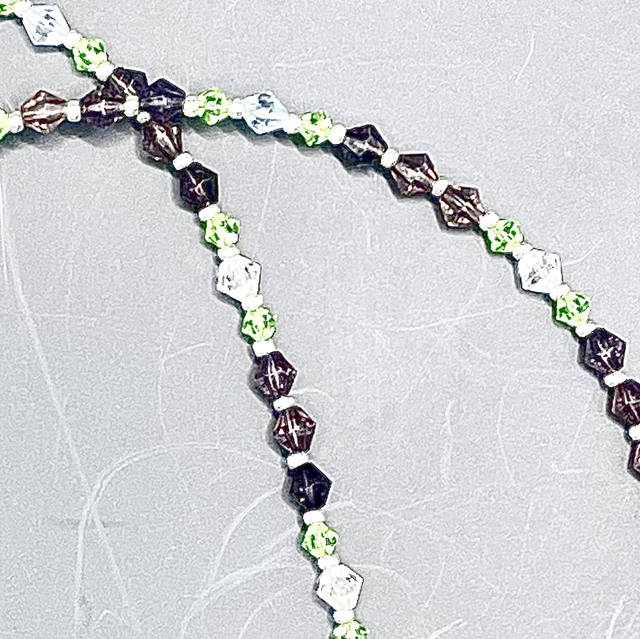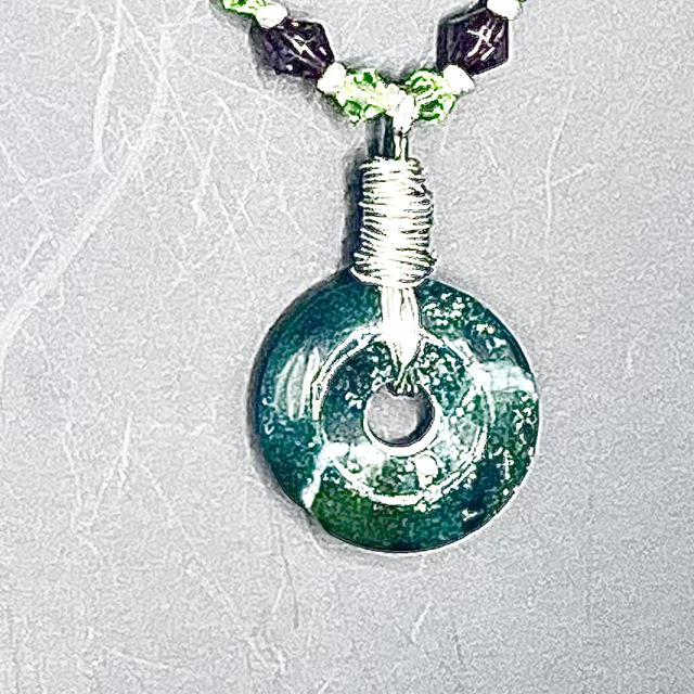 Collier perles verre à facettes et inter-perles de rocaille argentées. Pendentif donut jade néphrite.