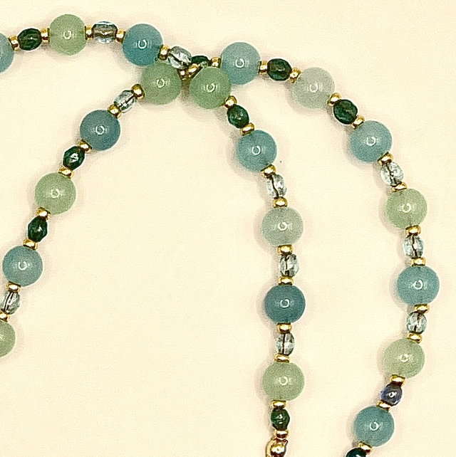 Collier perles en verre vert d’eau et inter-perles vertes et dorées.