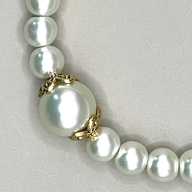 Bracelet perles en résine nacrées. Plus grosse perle centrale entourée d’inter-perles acier inoxydable doré.