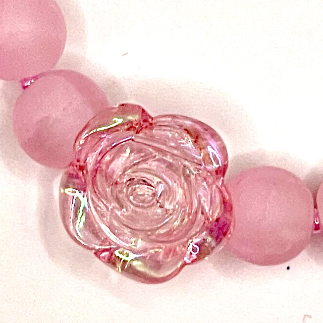 Bracelet perles en verre mates roses. Perle centrale fleur en acrylique rose.